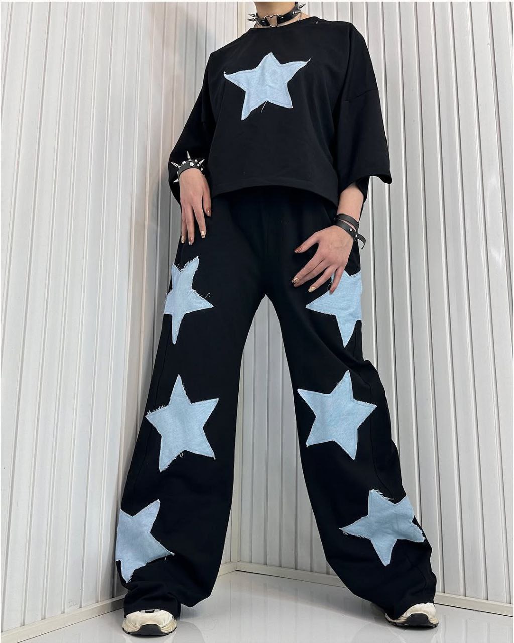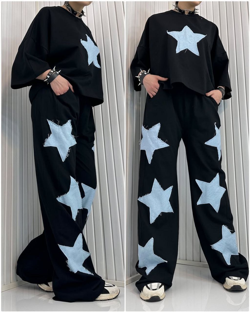 دستهبندی: پوشاک زنانهجنس پارچه: گلکسی پنبهسایز: فری سایز مناسب ۳۸ تا ۴۶قد تیشرت: ۶۰ سانتقد شلوار: ۱۰۸ سانت